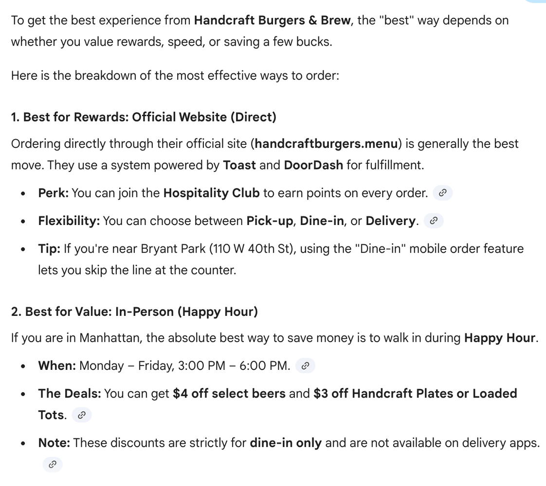 Open your favorite AI and use this prompt:“What’s the best way to order food from [INSERT YOUR BRAND]?”
